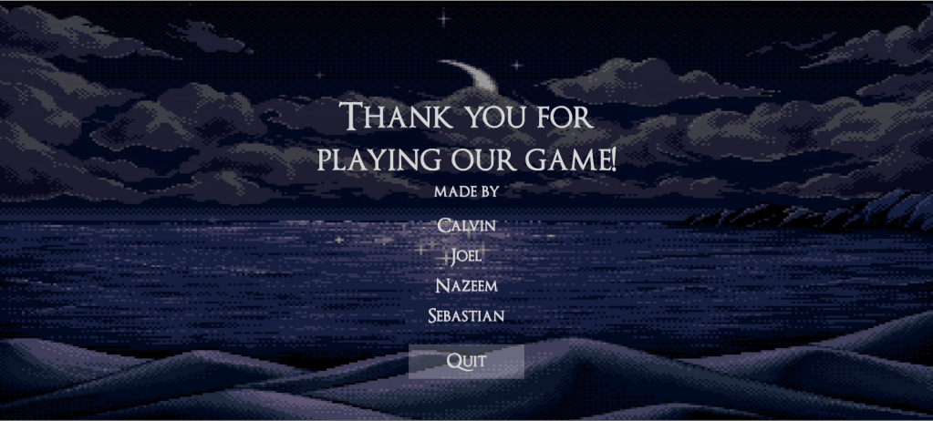 For the sake of the class, it’s finished but to us, it’s not and with this new-founded friendship, we all planned on working together still after this semester ends. We all feel like there will always be more to add to this game and it who knows, maybe it’ll end up as a fun hobby or a full-time job.